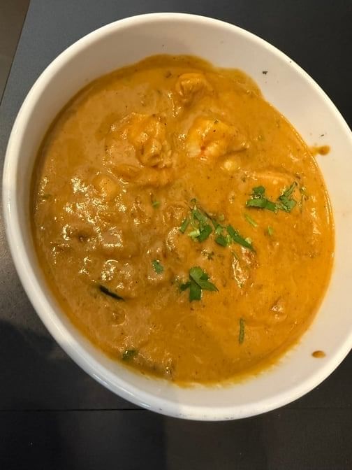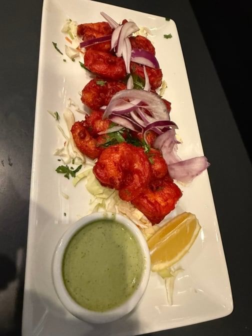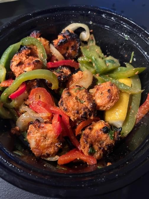 Shrimp marinated in yogurt, garlic, ginger, and spices, then cooked in a traditional tandoor oven.