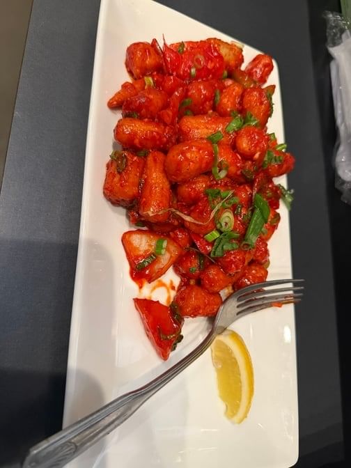 Cubes of marinated fried fish cooked with 7 spiced special sauce.