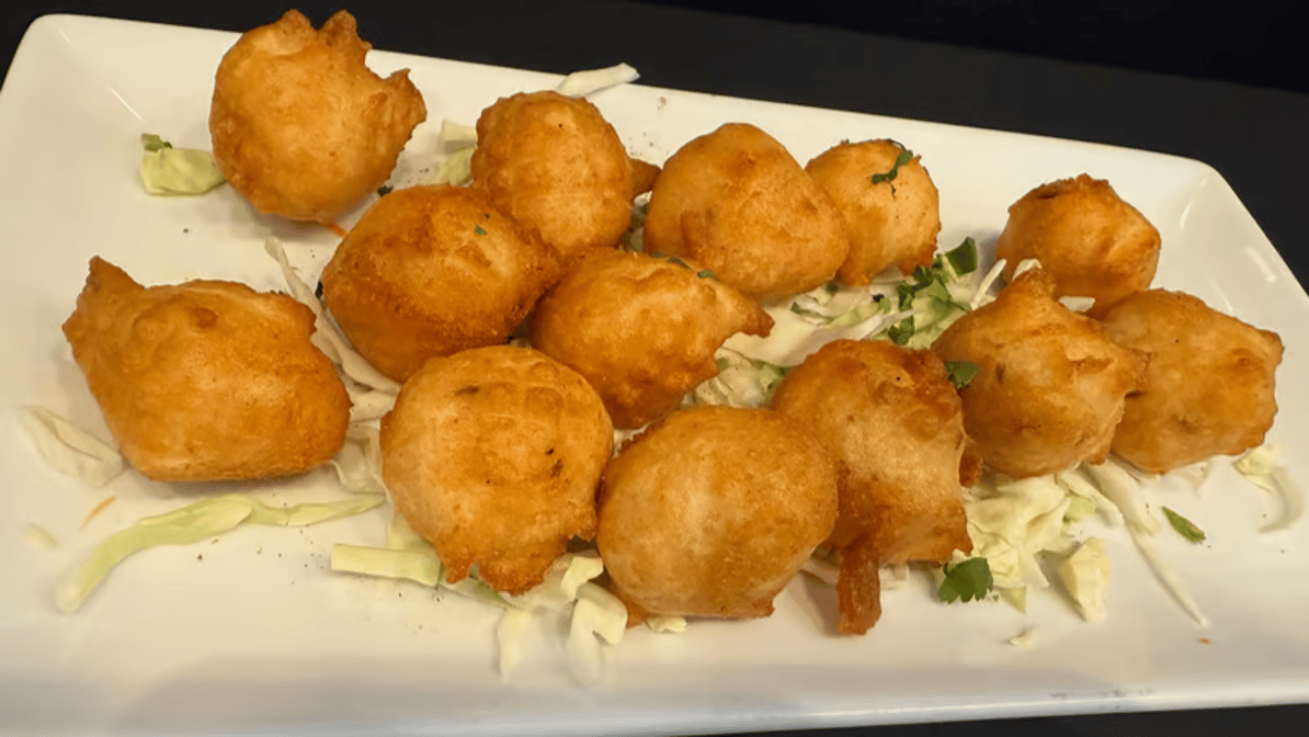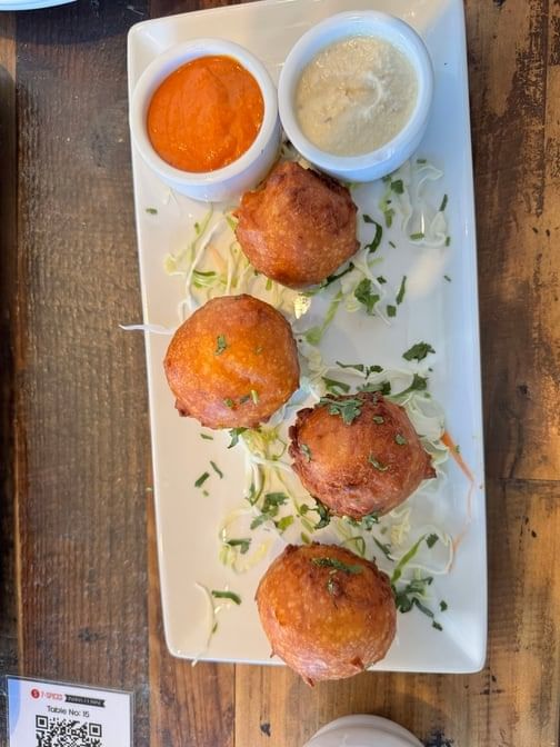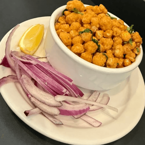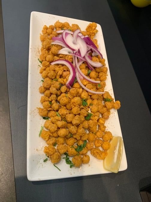 Chana (Garbanzo Beans) marinated with south Indian spices and deep fried.