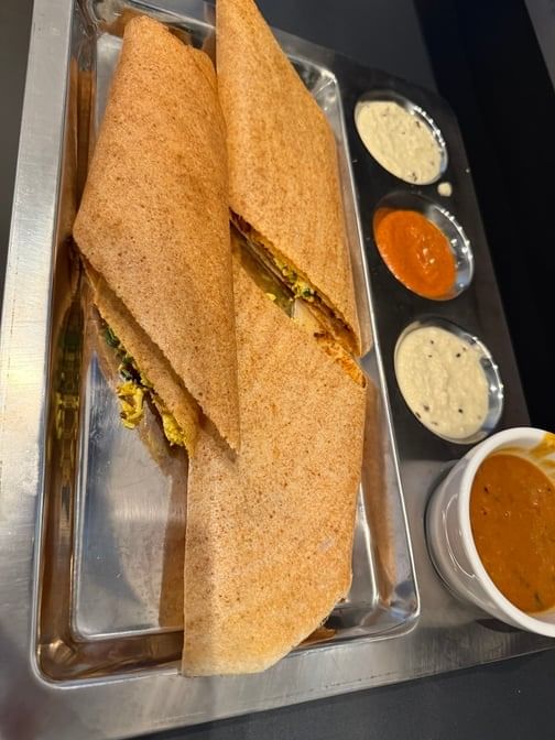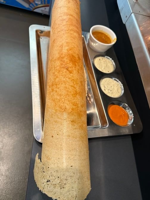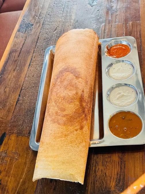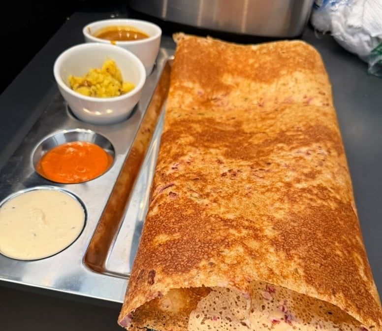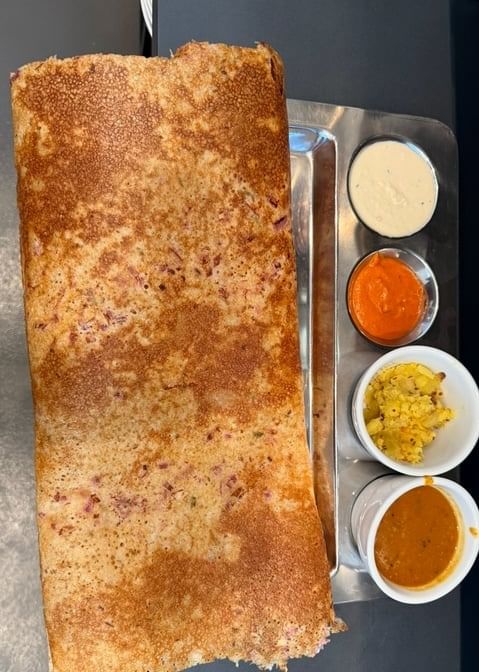 Fluffy rice crepe topped with three toppings of your choice. Available toppings: Onions, Tomatoes, Chillies, Cheese, Paneer.