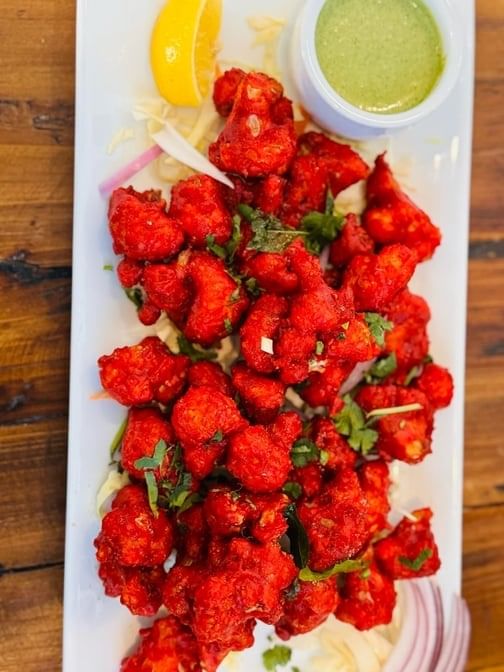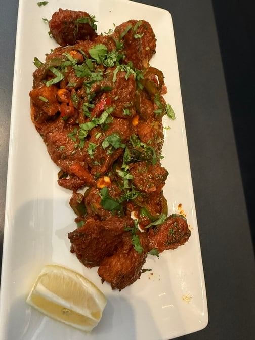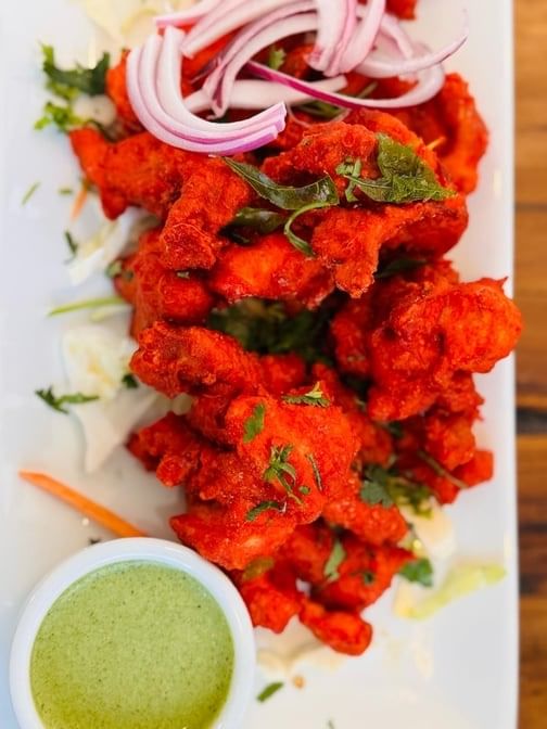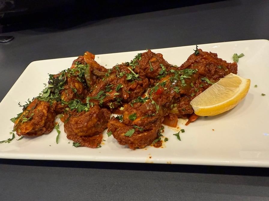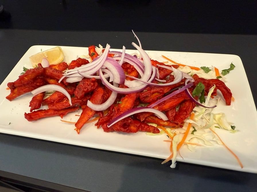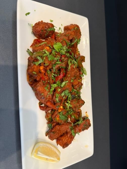 Boneless chicken marinated with southern Indian spices and deep fried.