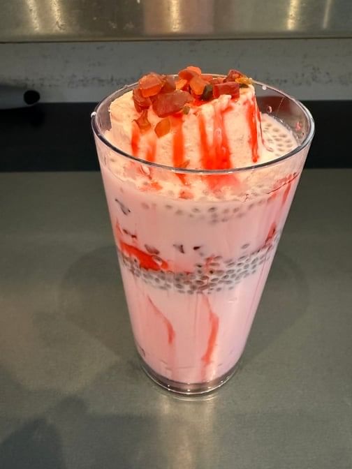 Flavourful drink made wh thin sev, Basil seeds, rose milk and topped with ice cream.