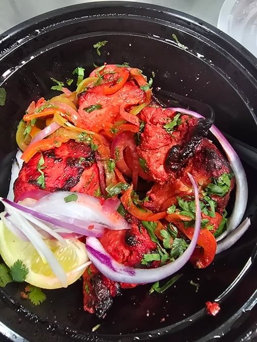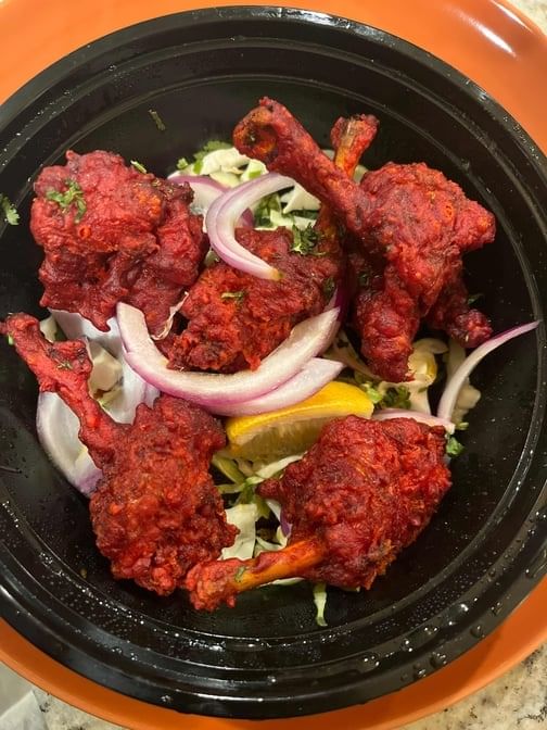 Marinated chicken (2 leg quarters) cooked in a Tandoori Clay Oven.