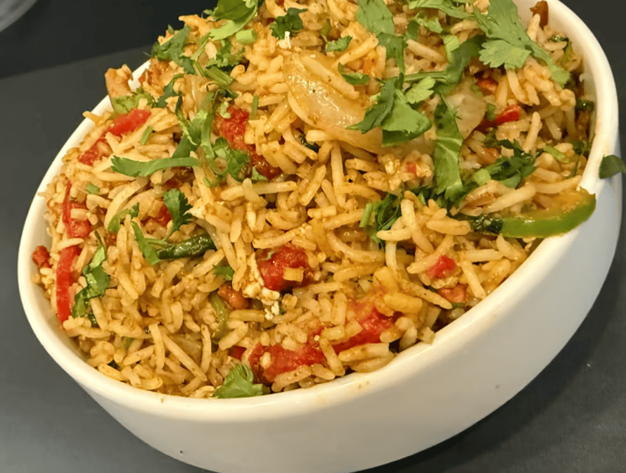 Indo-Chinese style fried rice tossed with Vegetables and Vijayawada special sauce and Indian Cottage Cheese.