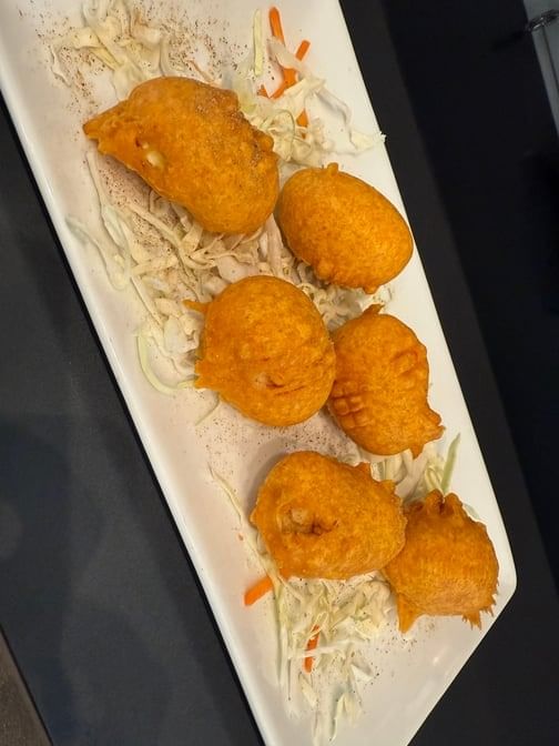 Cubes of fish marinated with Southern Indian Spices and deep fried.