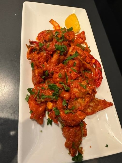 A whole fish(Golden Pompano) marinated with Tandoori masala and cooked in Clay Pot Oven to perfection.
