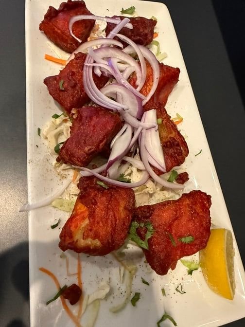 Cubes of fish marinated in spicy masala and deep fried. Garnished with onion and lemon wedges.