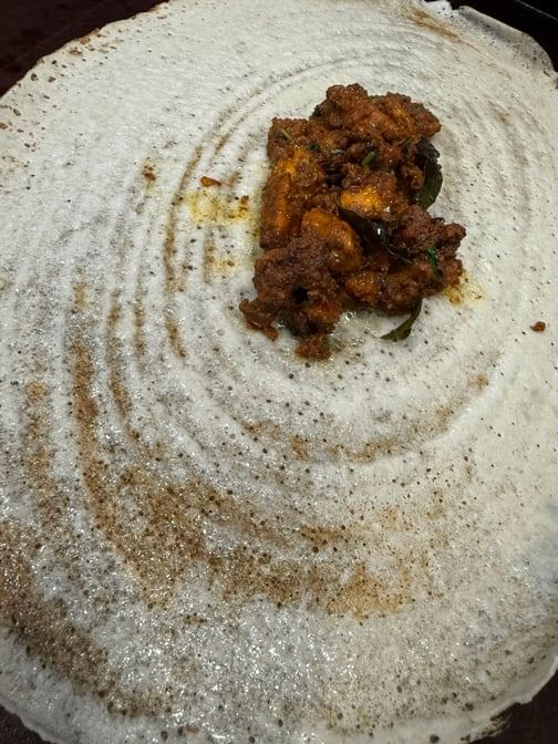 Rice crepe topped with onion, tomatoes,chillies, cilantro and drizzled with podi cooked with gingely(Sesame oil).